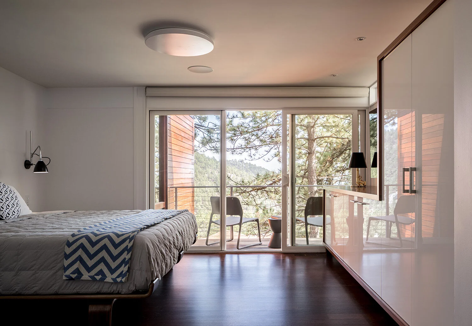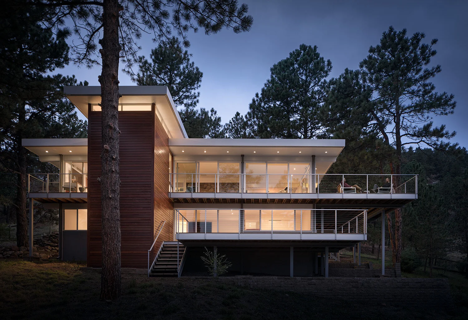 The house occupies a hillside in Sunshine Canyon outside of Boulder, Colorado. While the site has spectacular views and a lush, isolated setting, the original house lacked a sense of interior movement and strong connection to its surroundings. The project objective was to address these shortcomings, substantially expand and gut-renovate the entire house, and ultimately create a new residence with generous living spaces and a definite sense of place.