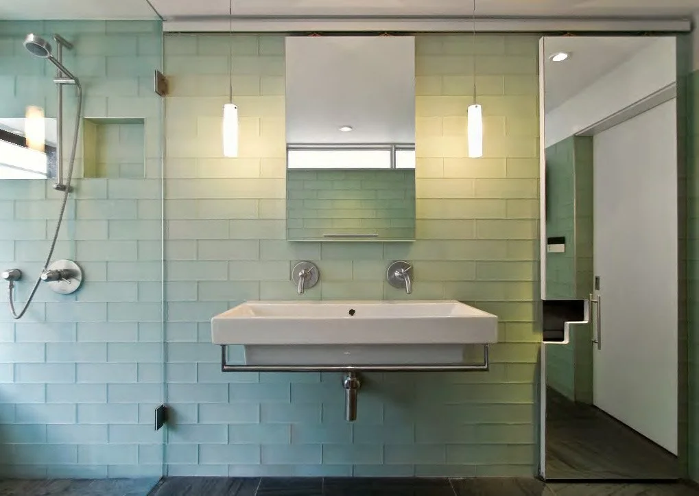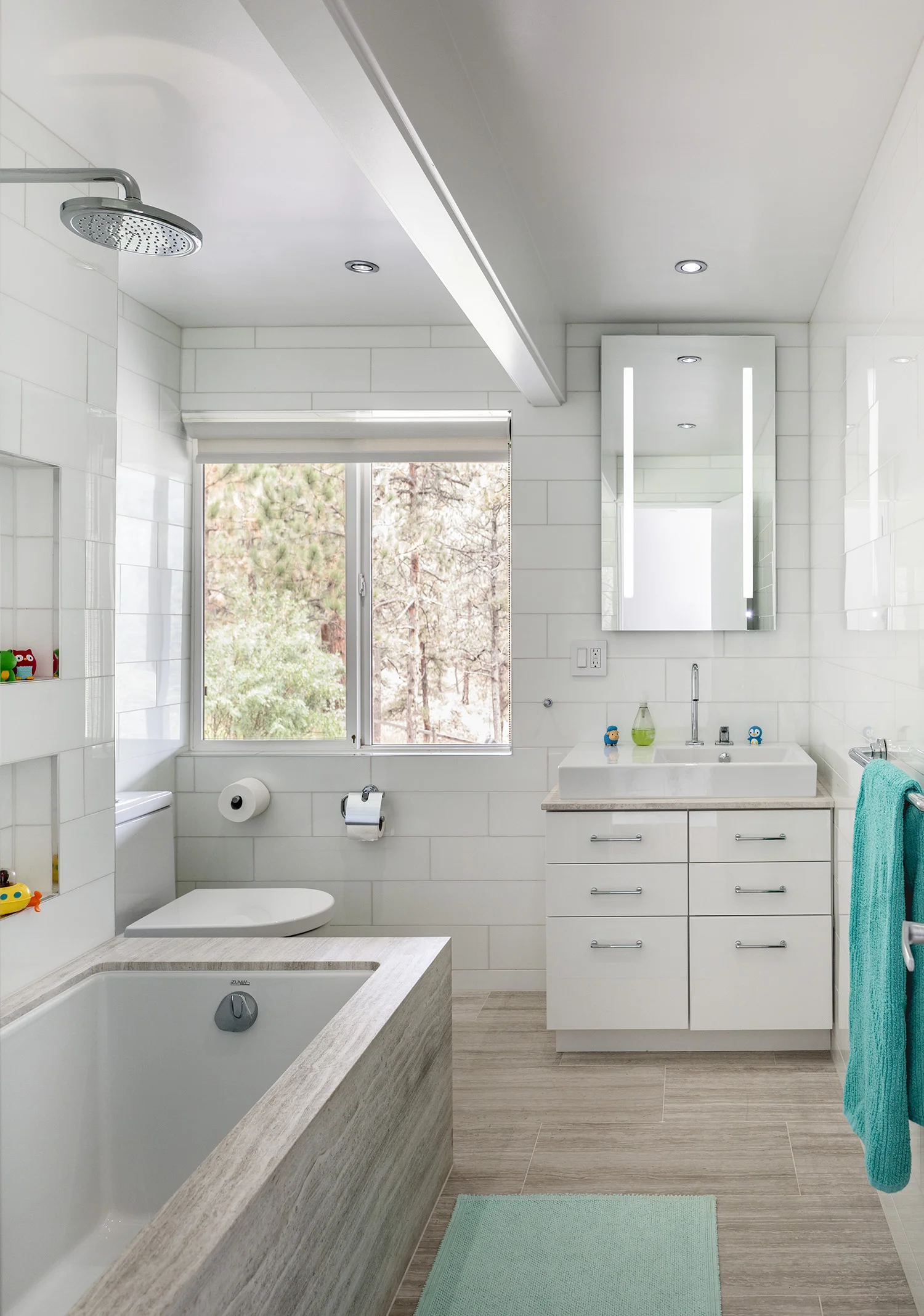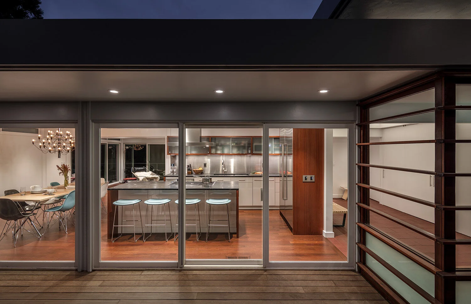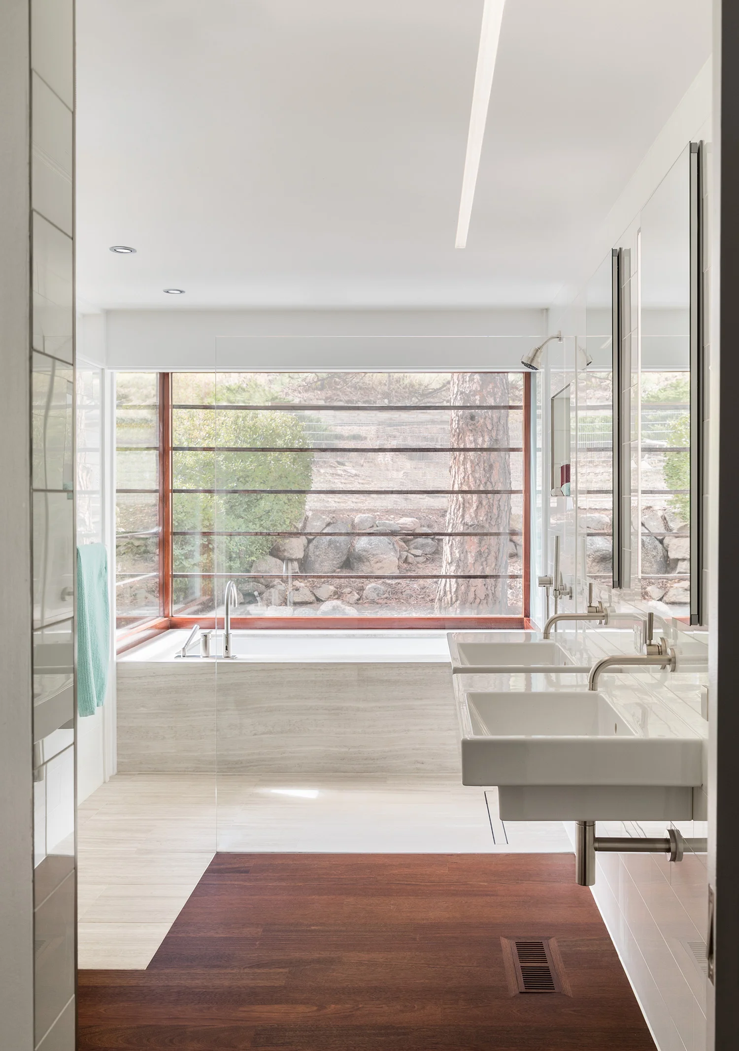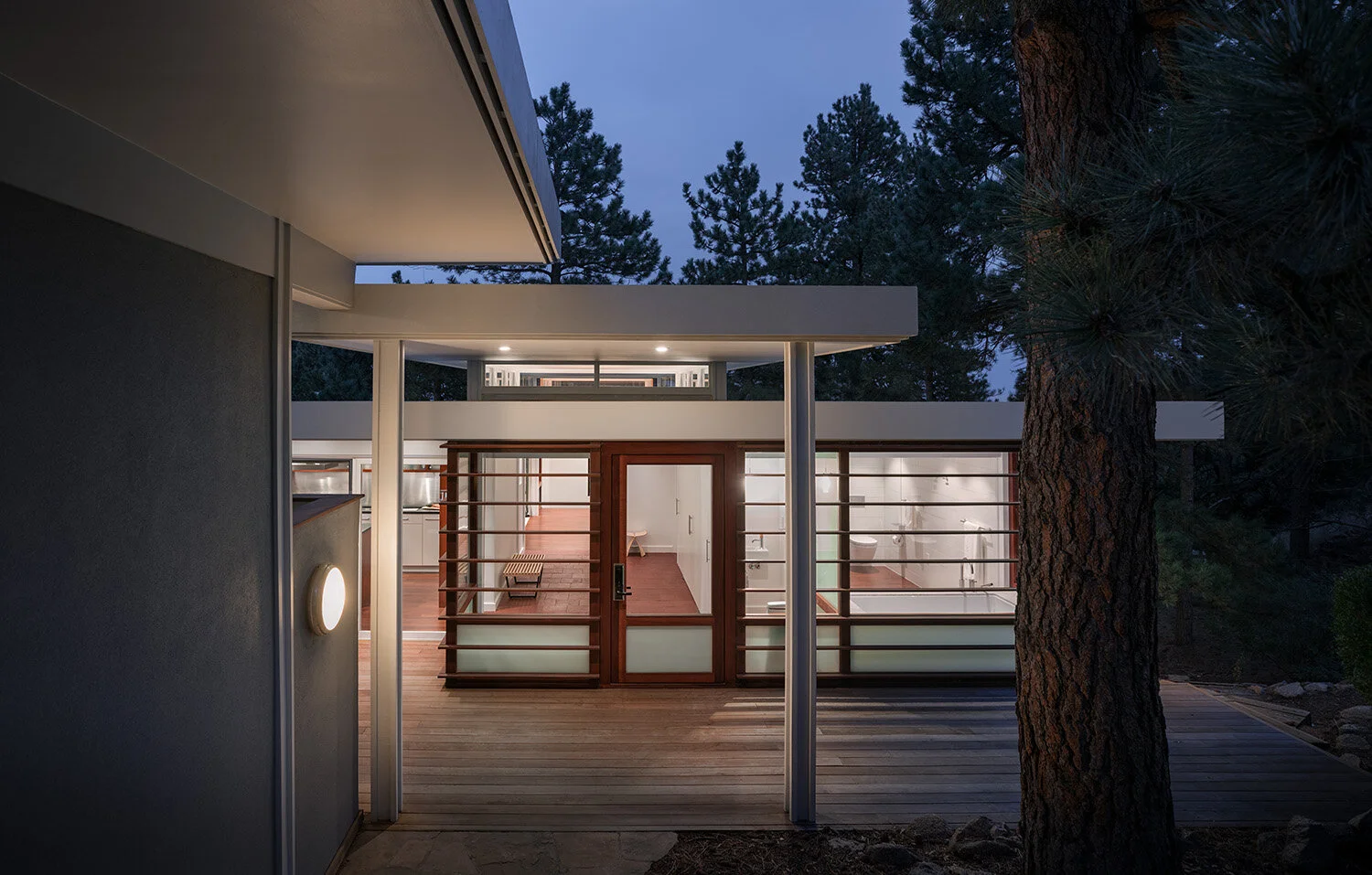 Several portions of the house have been opened up and expanded, refocused, and reconfigured. A new glass volume and redwood screen extends the previously undefined entryway. Planar elements such as the flat roofs and clerestory are reintroduced to present a more transparent and permeable façade. The wood screens and siding add texture and accentuate the home’s horizontality in the mountain’s landscape. Glass volumes and continuous finishes blur the boundary between the indoor and outdoor spaces including the Master Bathroom where one may bathe while immersed in the front grove of trees, and in the Living Room, where expansive interior spaces help unite unobstructed views outdoors to the landscape and the redwood architecture.