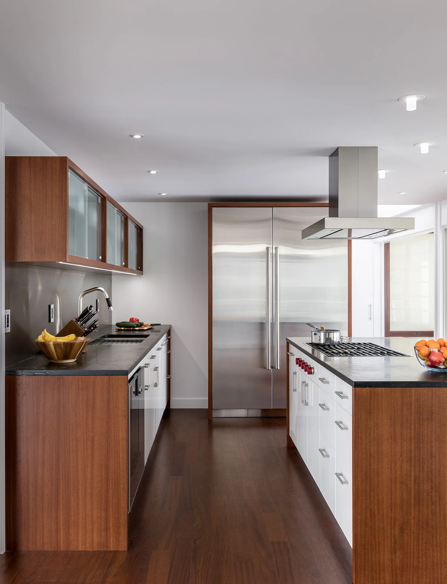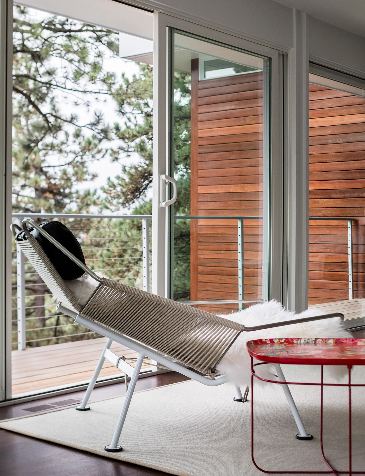 The core of the house is a collection of horizontal volumes and planes of white stucco and wood. A combination of extended redwood decks, balconies, towers and glass volumes occupy the perimeter. These intersecting geometries allow for vertical movement and unobstructed horizontal views while giving the exterior a rhythm of form and material that give the house a human scale.