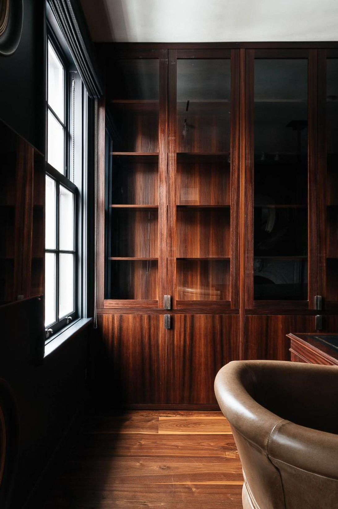 A central stair—reclaimed walnut treads, blackened steel plate and glass guardrails—joins the five levels of the residence. An central elevator core of Vermont limestone and fumed larch adaptable partitions contrasts the transparency of the home's rear facade and glazed penthouse. The home's intricately detailed lobby library retains the historical nature of Samuel Chase's 19th century vision. Special attention was used to ensure spaces at the perimeter of home expanded the entire 25' length of the building, providing sufficient light and space.